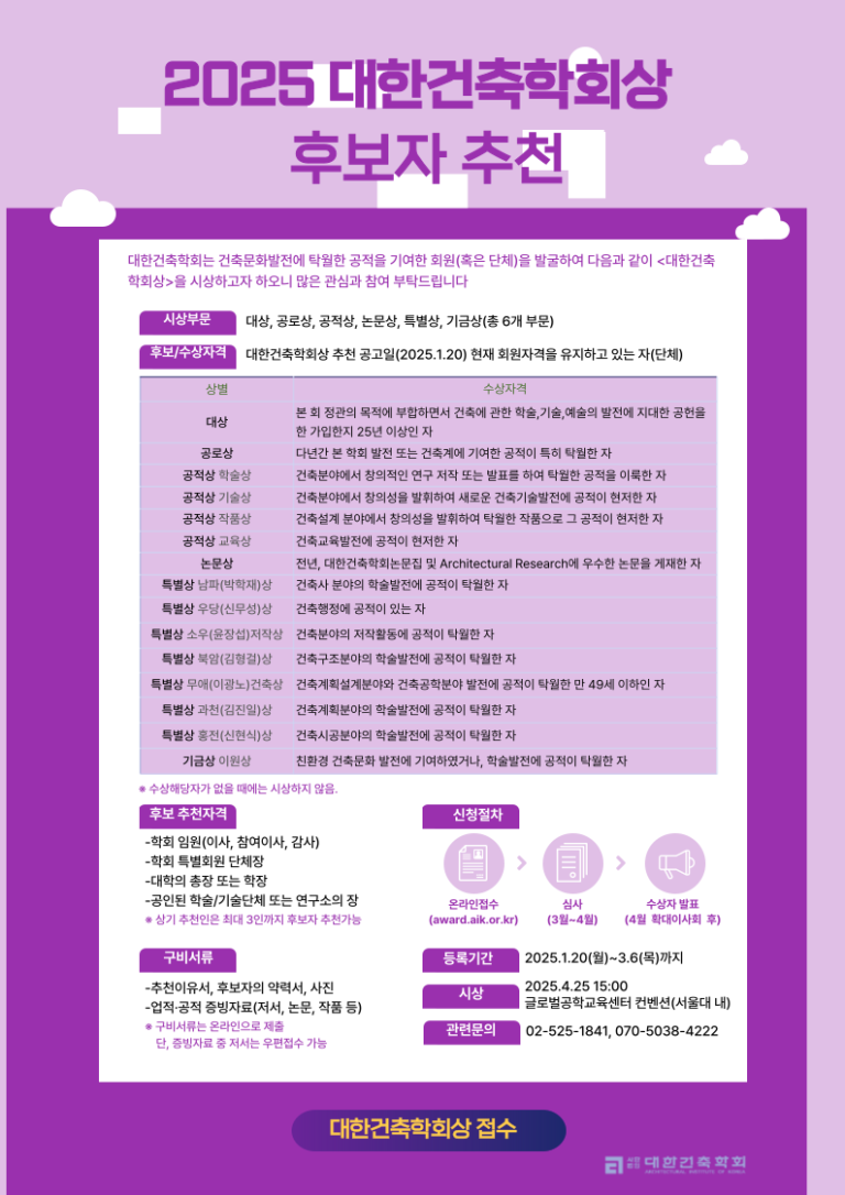 우수 건축물, 건축설계 및 건축 관련 작품을 발굴·시상하여 건축 관계자의 창작 의욕을 고취하고 건축문화 진흥을 도모하기 위하여 국토교통부에서 「2025 한국건축문화대상」 공모를 시행합니다. 공모는 건축물 부문(공공/민간/주택/한옥 분야), 건축문화진흥 부문, 학생설계 부문(일반/한옥 분야)으로 구분되어 시행됩니다. 각 부문별 세부…