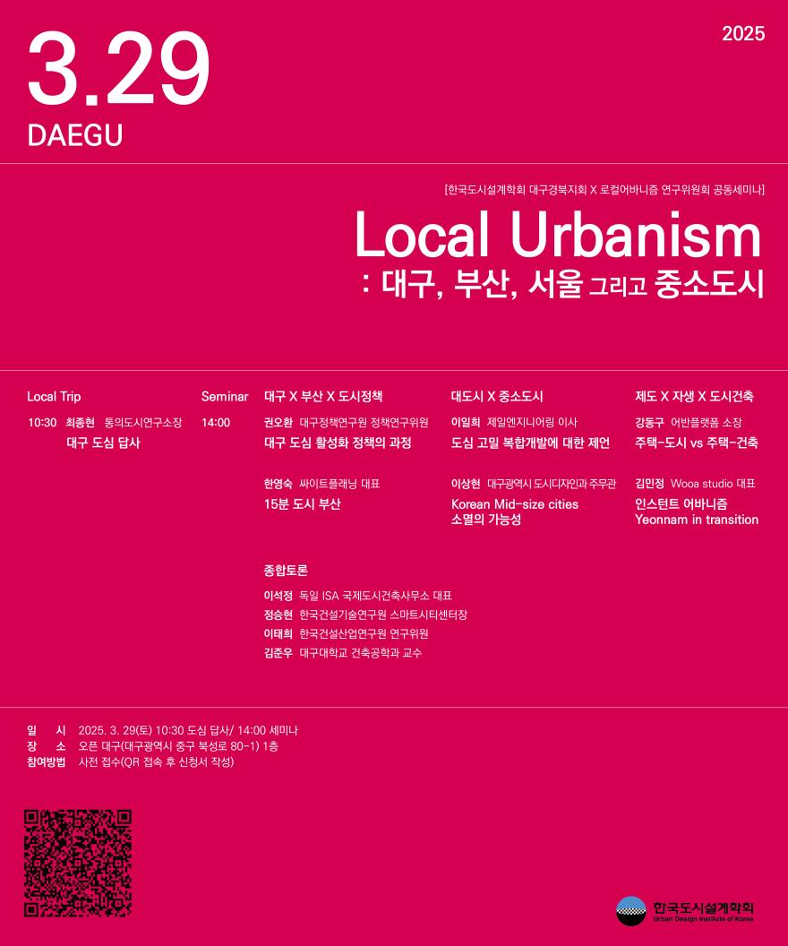 우리학회 대구경북지회(지회장: 최영은)와 로컬어바니즘연구위원회(위원장: 김준우)에서는 「’Local Urbanism : 대구, 부산, 서울 그리고 중소도시‘」라는 주제로 세미나 및 로컬 트립을 진행하고자 합니다.