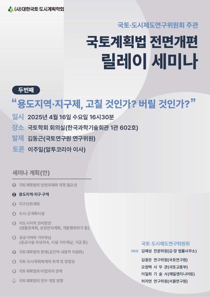 [대한국토도시계획학회 국토·도시제도연구위원회] ‘용도지역·지구제, 고칠 것인가? 버릴 것인가?’ 세미나(4/16) Post published:2025년 3월 17일 Post category:포럼/세미나 원출처 : https://kpa1959.or.kr/index.html?menuno=23&bbsno=25040&boardno=541&ztag=rO0ABXQAOTxjYWxsIHR5cGU9ImJvYXJkIiBubz0iNTQxIiBza2luPSJmcmVlX2ludGVybG9jayI%2BPC9jYWxsPg%3D%3D&siteno=17&act=view Tags: 국토계획법, 국토도시제도연구위원회, 대한국토도시계획학회, 용도지역지구제 Read more articles Previous Post[대한국토도시계획학회 지역발전연구위원회] ‘지역균형발전을 위한 개헌과 수도이전 논의’ 공동세미나(3/28) Next Post미래 국토전략 논의…국토ㆍ교통ㆍ환경 전문가 한자리에
