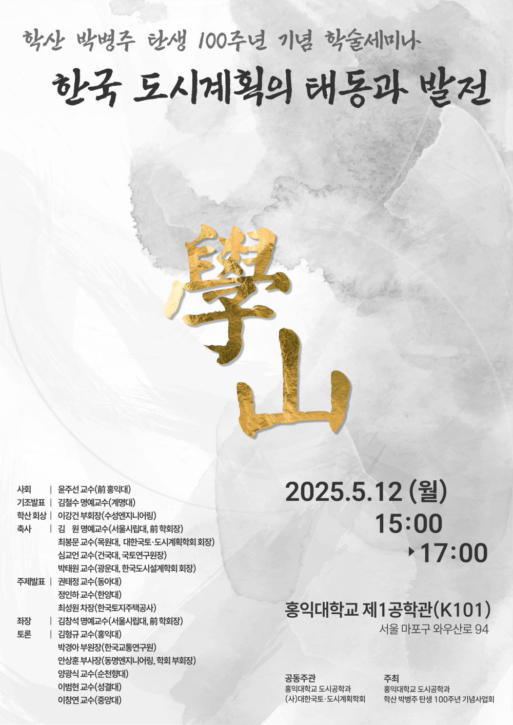 학산 박병주 탄생 100주년 기념 학술세미나(5/12) Post published:2025년 4월 21일 Post category:포럼/세미나 원출처 : https://kpa1959.or.kr/index.html?menuno=35&bbsno=26066&boardno=537&ztag=rO0ABXQAOTxjYWxsIHR5cGU9ImJvYXJkIiBubz0iNTM3IiBza2luPSJmcmVlX2ludGVybG9jayI%2BPC9jYWxsPg%3D%3D&siteno=17&act=view Tags: 도시계획, 박병주 Read more articles Previous Post‘스토리텔링기법으로 구성한우리나라 국토도시계획의 역사’ 세미나 Next Post[대한국토도시계획학회 탄소중립도시연구위원회-탄소중립도시계획연구단] ‘탄소중립 도시계획을 위한 탄소공간지도 활용 사례’ 공동세미나(4/25)
