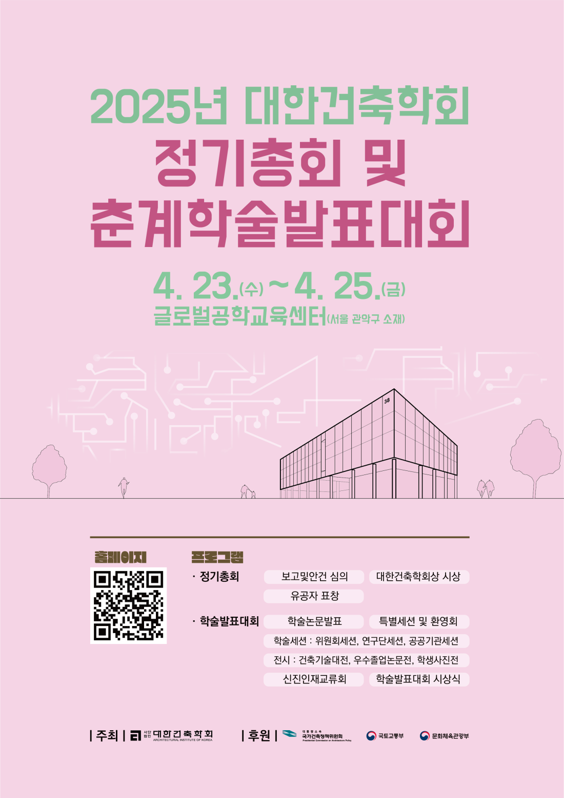 본 학회는 대한민국 건축산업과 건축문화의 국가경쟁력 제고를 위하여 2025년 4월 23일(수)부터 25일(금)까지