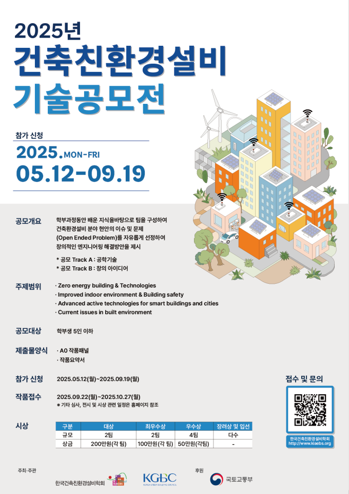 건축환경설비와 에너지에 대한 지식을 창의적 건축공학 기술을 통하여 표현할 수 있는 2025년 건축친환경설비기술 공모전을 개최합니다.