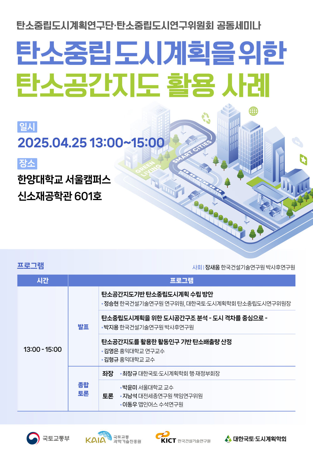 탄소중립도시연구위원회(위원장: 정승현 한국건설기술연구원 연구위원)에서는 ‘탄소중립 도시계획을 위한 탄소공간지도 활용 사례’를 주제로 탄소중립도시계획연구단과 공동 세미나를 개최합니다. 회원 여러분의 많은 관심과 참여 바랍니다.