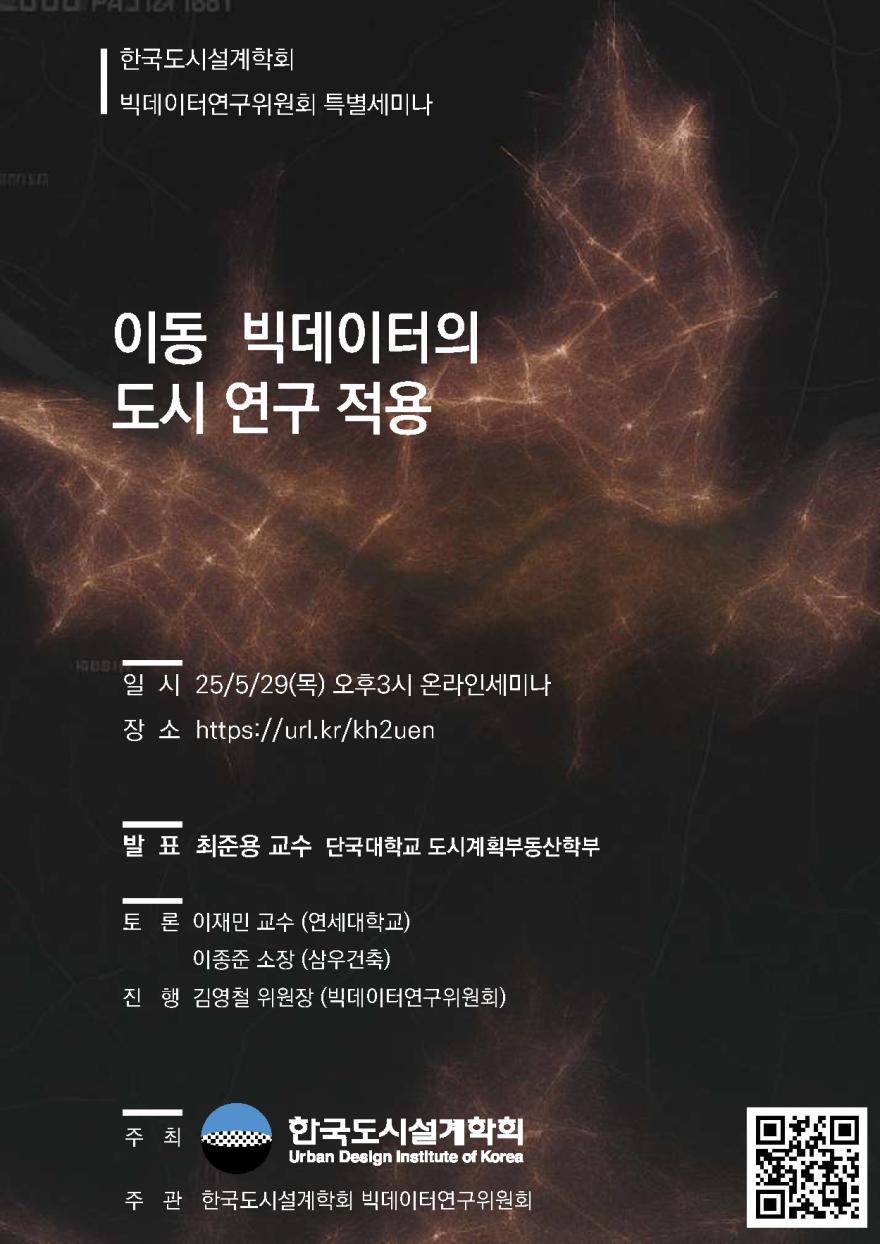 우리 학회 빅데이터연구위원회(위원장 : 김영철)에서는 “이동 빅데이터의 도시 연구 적용”이라는 주제로 아래와 같이 특별세미나를 개최하오니 관심있는 회원분들의 많은 참여를 부탁드립니다.