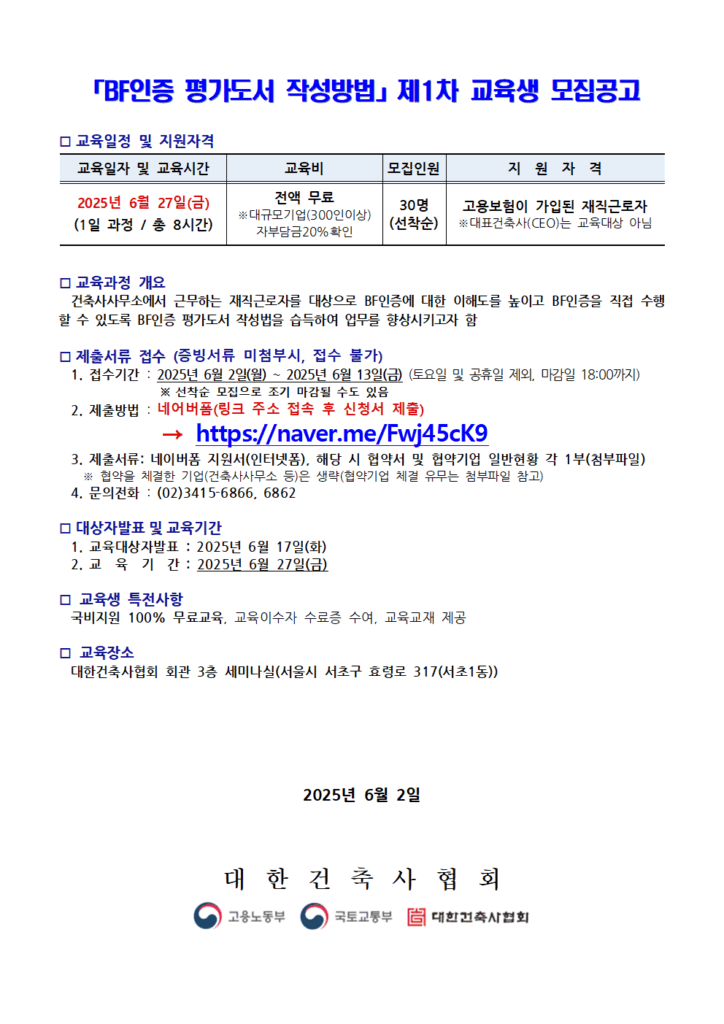 「BF인증 평가도서 작성방법」제1차 교육생 모집공고 Post published:2025년 6월 4일 Post category:포럼/세미나 원출처 : https://www.kira.or.kr/jsp/main/01/01.jsp?ba_bbsId=BBS_00_NOTICE&bbsLocale=&sc_ba_bbsId=BBS_00_NOTICE&mode=read&sc_ba_cateId=&sc_scType=1&sc_keyword=&sc_ba_titleL=&sc_ba_authorNameL=&ba_id=256965 Tags: BF인증, 대한건축사협회 Read more articles Previous Post제6차「건축물 해체공사 감리업무 신규교육」6월 교육생 모집공고 Next Post제4차 「건축물 해체공사 감리업무 보수교육」교육생 모집공고(6월)_제주교육