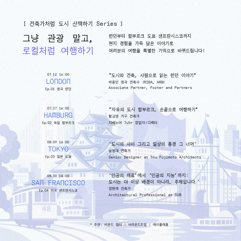 ‘건축가처럼 도시 산책하기’는 Beyond Chapter, 어라운드 트립, 에이플래폼이 함께 기획한 시리즈 강연입니다.