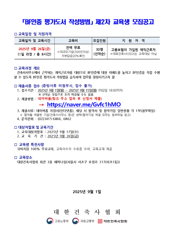 제2차「BF인증 평가도서 작성방법」교육생 모집공고 Post published:2025년 9월 1일 Post category:포럼/세미나 원출처 : http://www.kira.or.kr/jsp/main/01/01.jsp?ba_bbsId=BBS_00_NOTICE&bbsLocale=&sc_ba_bbsId=BBS_00_NOTICE&mode=read&sc_ba_cateId=&sc_scType=1&sc_keyword=&sc_ba_titleL=&sc_ba_authorNameL=&ba_id=258476 Tags: BF인증, 대한건축사협회, 평가도서 Read more articles Previous Post제21차 인천 아시아건축사대회: ‘전통건축의 발전을 위한 심포지움’ Next Post「공사감리 전문교육」9월 집합교육 교육생(건축사) 모집 안내