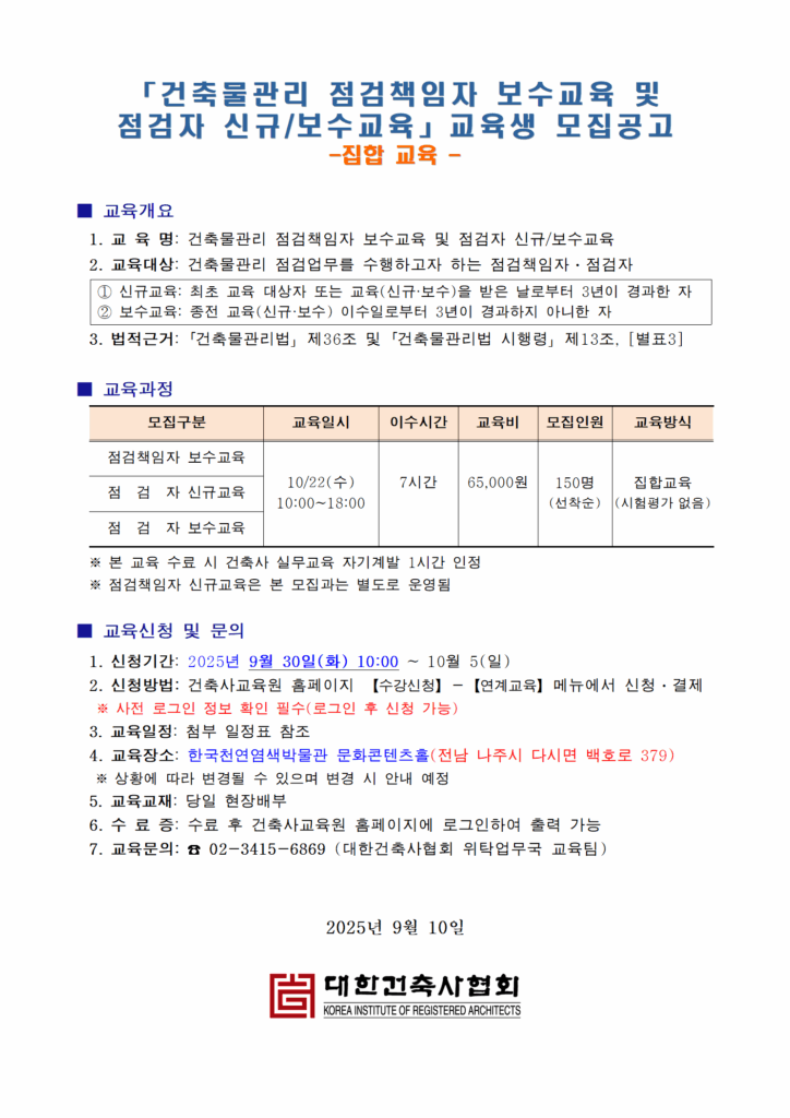 2025년 제8차「건축물관리 점검책임자 보수 및 점검자 신규/보수교육」교육생 모집공고 Post published:2025년 9월 18일 Post category:포럼/세미나 원출처 : http://www.kira.or.kr/jsp/main/01/01.jsp?ba_bbsId=BBS_00_NOTICE&bbsLocale=&sc_ba_bbsId=BBS_00_NOTICE&mode=read&sc_ba_cateId=&sc_scType=1&sc_keyword=&sc_ba_titleL=&sc_ba_authorNameL=&ba_id=258814 Tags: 건축물관리, 대한건축사협회, 점검책임자 Read more articles Previous Post제10차 「건축물 해체공사 감리업무 보수교육」교육생 모집공고(9월)_강원교육 Next Post2025년 제5차「건축물관리 점검책임자 신규교육」교육생 모집공고