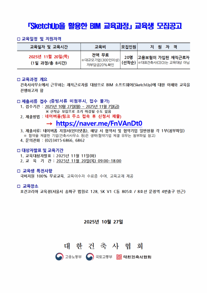 제1차「SketchUp을 활용한 BIM교육과정」교육생 모집공고 Post published:2025년 10월 27일 Post category:포럼/세미나 원출처 : http://www.kira.or.kr/jsp/main/01/01.jsp?ba_bbsId=BBS_00_NOTICE&bbsLocale=&sc_ba_bbsId=BBS_00_NOTICE&mode=read&sc_ba_cateId=&sc_scType=1&sc_keyword=&sc_ba_titleL=&sc_ba_authorNameL=&ba_id=259385 Tags: BIM, 대한건축사협회, 스케치업 Read more articles Previous Post제11차「건축물 해체공사 감리업무 신규교육」11월 교육생 모집공고 Next Post2025년 제6차「건축물관리 점검책임자 신규교육」교육생 모집공고