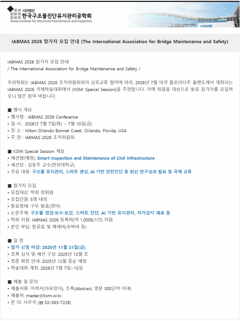 IABMAS 2026 참가자 모집 안내 (The International Association for Bridge Maintenance and Safety) Post published:2025년 11월 9일 Post category:기타 원출처 : https://www.ksmi.or.kr/board/?_0000_method=view&ncode=a001&num=1595 Tags: IABMAS, 미국, 한국구조물진단유지관리공학회 Read more articles Previous Post제1회 구조물 진단 및 유지관리 기술 영상 콘텐츠 공모전