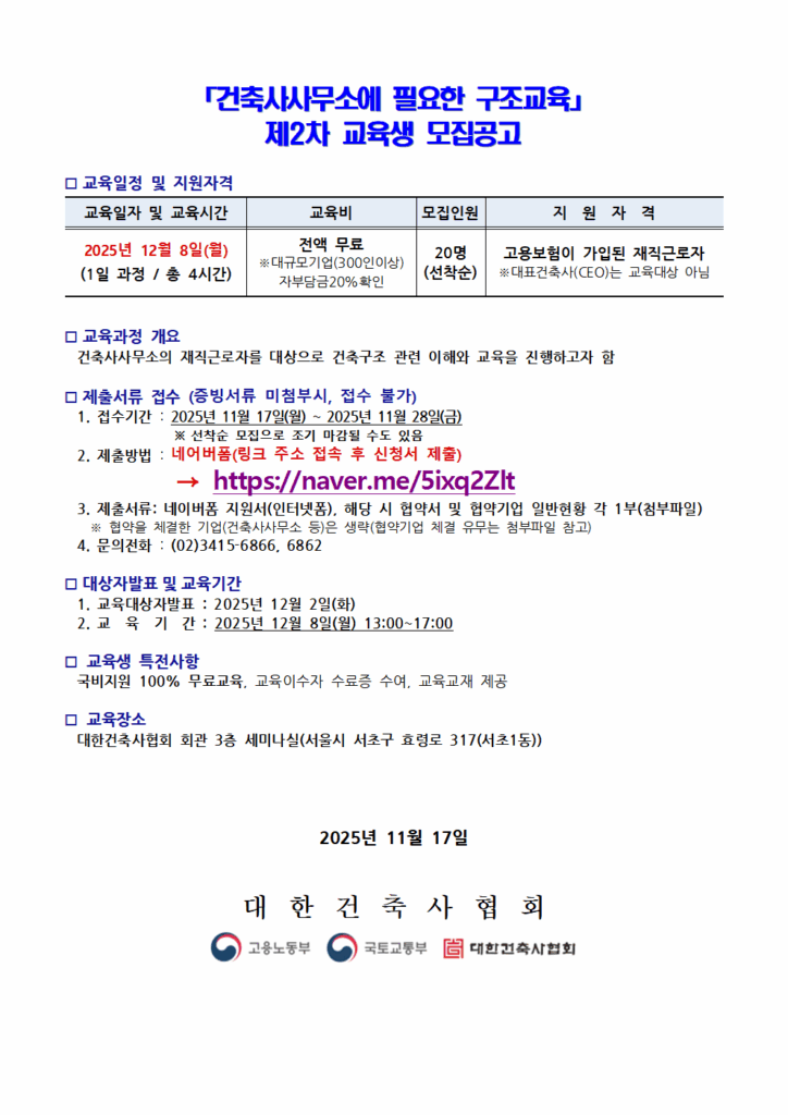 제2차『건축사사무소에 필요한 구조교육』 교육생 모집공고 Post published:2025년 11월 17일 Post category:포럼/세미나 원출처 : http://www.kira.or.kr/jsp/main/01/01.jsp?ba_bbsId=BBS_00_NOTICE&bbsLocale=&sc_ba_bbsId=BBS_00_NOTICE&mode=read&sc_ba_cateId=&sc_scType=1&sc_keyword=&sc_ba_titleL=&sc_ba_authorNameL=&ba_id=259870 Tags: 건축구조, 건축사사무소, 대한건축사협회 Read more articles Previous Post2025년 제10차「건축물관리 점검책임자 보수 및 점검자 신규/보수교육」교육생 모집공고 Next Post 제4차「에너지 절약계획서 실무해설」교육생 모집공고