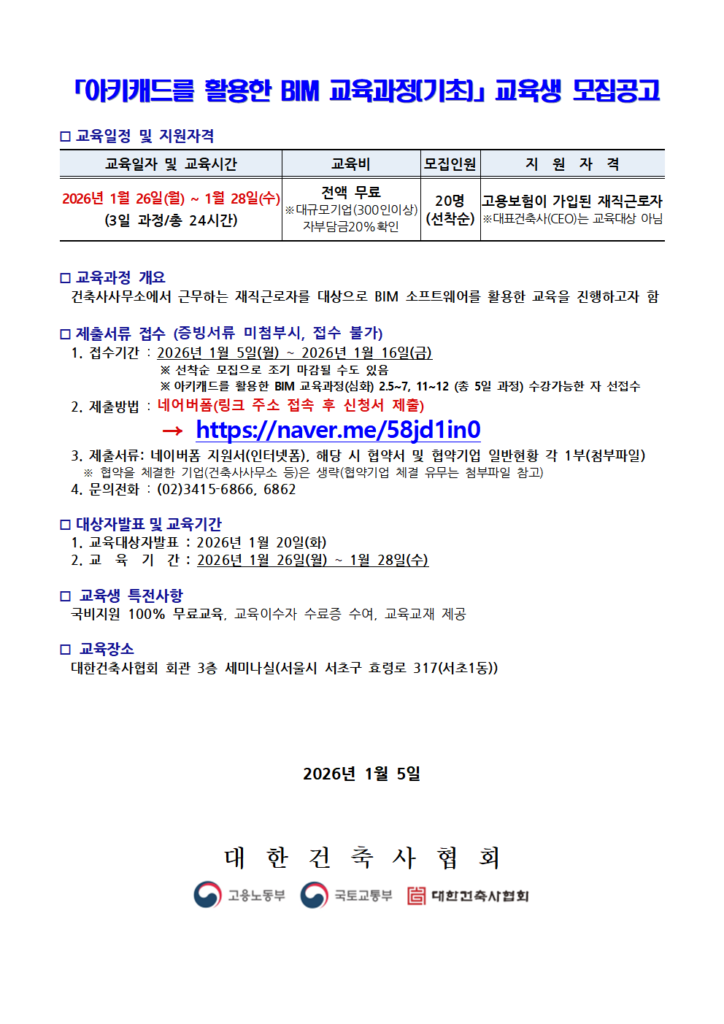 제1차『아키캐드를 활용한 BIM 교육과정(기초)』교육생 모집공고 Post published:2026년 1월 5일 Post category:포럼/세미나 Post comments:0 Comments 원출처 : https://www.kira.or.kr/jsp/main/01/01.jsp?ba_bbsId=BBS_00_NOTICE&bbsLocale=&sc_ba_bbsId=BBS_00_NOTICE&mode=read&sc_ba_cateId=&sc_scType=1&sc_keyword=&sc_ba_titleL=&sc_ba_authorNameL=&ba_id=260688 Tags: BIM, 대한건축사협회, 아키캐드 Read more articles Previous Post2026년 해체공사감리 보수교육 1월 교육 모집공고