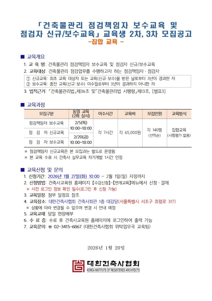 2026년 제2~3차「건축물관리 점검책임자 보수 및 점검자 신규/보수교육」교육생 모집공고 Post published:2026년 1월 21일 Post category:포럼/세미나 Post comments:0 Comments 원출처 : http://www.kira.or.kr/jsp/main/01/01.jsp?ba_bbsId=BBS_00_NOTICE&bbsLocale=&sc_ba_bbsId=BBS_00_NOTICE&mode=read&sc_ba_cateId=&sc_scType=1&sc_keyword=&sc_ba_titleL=&sc_ba_authorNameL=&ba_id=261030 Tags: 건축물관리, 대한건축사협회, 점검책임자 Read more articles Previous Post15차「건축물 해체공사 감리업무 보수교육」2월 교육생 모집공고