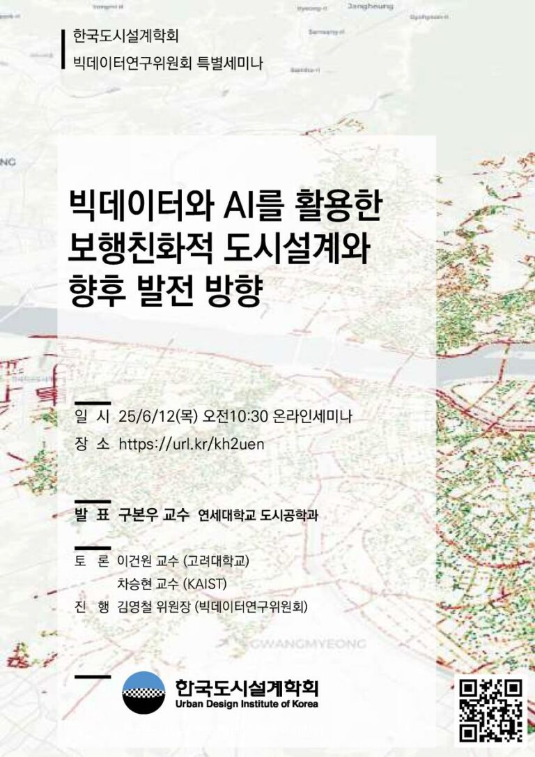 우리학회 빅데이터연구위원회(위원장: 김영철)와 교과과정개발연구위원회(위원장: 강범준)에서는 「도시설계 스튜디오와 생성형 AI: 우연한 적용과 논의들」 이라는 주제로 아래와 같이 공동 특별세미나를 개최하오니, 관심있는 회원분들의 많은 참여 부탁드립니다. 한국도시설계학회 회장 박태원빅데이터연구위원회 위원장 김영철교과과정개발연구위원회 위원장 강범준 o 일시: 2025년 11월 25일(화) 16시 o 장소: 학회…
