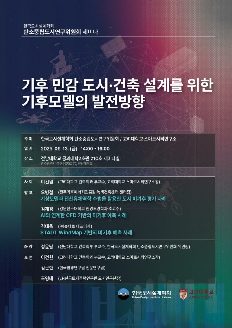 우리학회 스마트도시연구위원회(위원장: 김정곤) 에서는 「도시 바람 영향 시뮬레이션의 Geo-Process 자동화 및 고속화」 라는주제로 아래와 같이 온라인세미나를 개최하오니, 관심있는 회원분들의 많은 참여 부탁드립니다. 한국도시설계학회 회장 박태원스마트도시연구위원회 위원장 김정곤 ■ 일 시 : 2025년 11월 8일(토) 16:00■ 온라인(Zoom) : 555 888 0506 원출처 : https://udik.or.kr/board/?_0000_method=view&ncode=a0001&num=2041